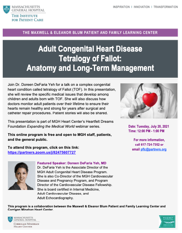 Join Dr. Doreen DeFaria Yeh for a talk on a complex congenital heart condition called tetralogy of Fallot (TOF). In this presentation, she will review the specific medical issues that develop among children and adults born with TOF. She will also discuss how doctors monitor adult patients over their lifetime to ensure their hearts remain healthy and strong for years after surgical and catheter repair procedures. Patient stories will also be shared. This presentation is part of MGH Heart Center’s Heartfelt Dreams Foundation Expanding the Medical World webinar series.